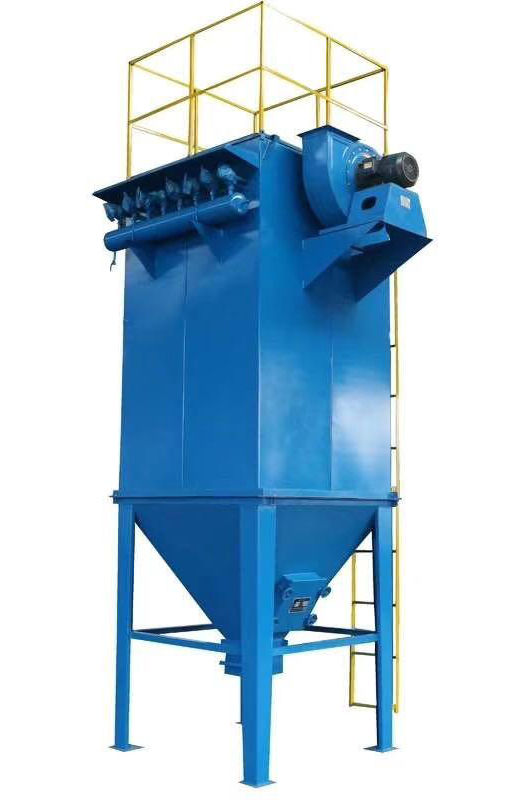 脈沖布袋除塵器由灰斗、上箱體、中箱體、下箱體等部分組成,上、中、下箱體為分室結(jié)構(gòu)。工作時(shí),含塵氣體由進(jìn)風(fēng)道進(jìn)入灰斗,粗塵粒直接落入灰斗底部,細(xì)塵粒隨氣流轉(zhuǎn)折向上進(jìn)入中、下箱體,粉塵積附在濾袋外表面,過濾后的氣體進(jìn)入上箱體至凈氣集合管-排風(fēng)道,經(jīng)排風(fēng)機(jī)排至大氣。 清灰過程是先切斷該室的凈氣出口風(fēng)道,使該室的布袋處于無氣流通過的狀態(tài)(分室停風(fēng)清灰)。然后開啟脈沖閥用壓縮空氣進(jìn)行脈沖噴吹清灰,切斷閥關(guān)閉時(shí)間足以保證在噴吹后從濾袋上剝離的粉塵沉降至灰斗,避免了粉塵在脫離濾袋表面后又隨氣流附集到相鄰濾袋表面的現(xiàn)象,使濾袋清灰徹底。