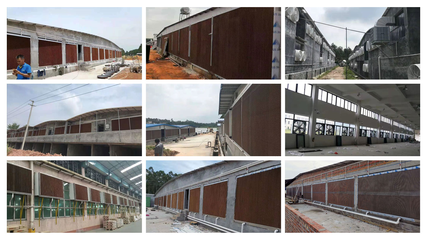 濕簾裝在密閉房舍一端山墻或側(cè)墻上,風(fēng)機(jī)裝在另一端山墻或側(cè)墻上,降溫風(fēng)機(jī)抽出室內(nèi)空氣,產(chǎn)生負(fù)壓迫使室外的空氣流經(jīng)多孔濕潤(rùn)濕簾表面時(shí),使空氣中大量熱量進(jìn)行轉(zhuǎn)化處理從而迫使進(jìn)入室內(nèi)的空氣降低10-15℃,并不斷的引入室內(nèi)進(jìn)行防暑降溫。